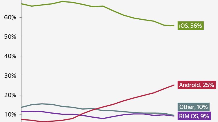 To ogromny wzrost, gdy porównujemy udziały Androida do np. listopada, gdzie wynik był aż o 17% mniejszy. O ile system Google'a pnie się w górę piorunującym tempem, o tyle niemal równie szybko traci iOS. Sytuacja RIM oraz innych platform jest w miarę ustabilizowana - toczy się zawzięty bój pomiędzy gigantami z Cupertino i Mountain View.