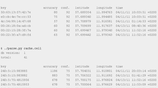 Jeśli macie dostęp do roota na swoich Androidach, to udajcie się do lokalizacji /data/data/com.google.android.location/files a następnie przyjrzyjcie plikom cache.wifi oraz cache.cell. W pierwszym zapisywane są lokalizacje wykonane przy pomocy WiFi, a w drugim przez sieć komórkową. Na szczęście w tym pliku cache.wifi zapisywanych jest "tylko" 200 ostatnich lokalizacji, a w cache.cell 50. Zawartość tych plików prezentuje się podobnie jak na zamieszczonym wyżej screenie.