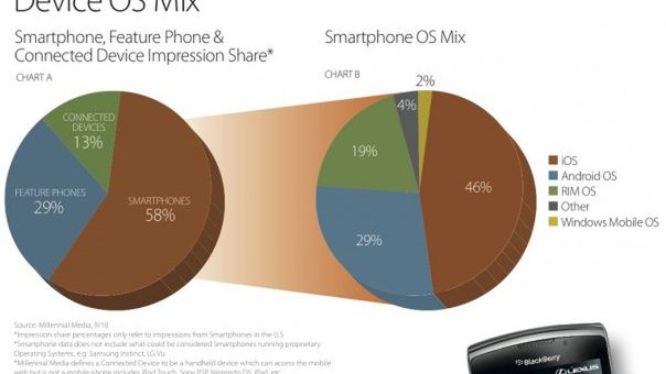 Biorąc pod uwagę iOS i reklamy, to w tym zakresie odnotowano wzrost jedynie o 18%, również pod względem stycznia 2010. Dziś komórki z Androidem zawojowały aż 29% ogólnego rynku - to potężny wzrost. Jednak aby jedna platforma zyskała, druga musi stracić. Tutaj wielkim przegranym jest iOS. W marcu 2010 mobilna platforma Apple'a zajęła 70% rynku, a dziś jest to jedynie 46%, czyli spadek ogromny.
