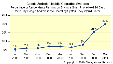 Firma ChangeWave opublikowała raport dotyczący ogólnego zainteresowania użytkowników poszczególnych platform komórkowych. Statystyki przedstawiają, że coraz więcej osób planuje w najbliższym czasie zakupić telefon z platformą Google. Zainteresowanie Androidami wzrosło aż o 9% względem grudnia 2009.