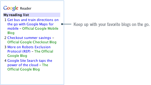 Przykładowe aplikacje to Maps, Gmail, YouTube czy wspomniany już Search ale są również i te mniej znane jak Notebook, Photos i News. Mi do gustu przypadł Reader który jest bardzo intuicyjnym i prostym czytnikiem kanałów RSS. Wszystkie dodatki oczywiście są darmowe a na komórkę możemy je wgrać przy pomocy komputera lub poprzez mobilną stronę Google.