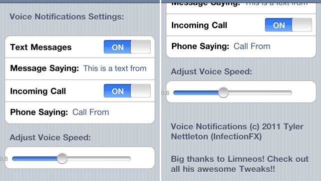 Ostatnio dosyć głośno w świecie iPhone'a o funkcjach głosowych, jakie oferuje iOS. Niedawno pisałem o VoiceActivator, czyli możliwości wdrożenia do iOS własnych poleceń głosowych, a dziś przychodzi pora na przymuszenie wbudowanego lektora do przemówienia. Dzięki aplikacji Voice Notifications, przed każdym połączeniem czy odebraną wiadomością, odtworzony zostanie odpowiedni komunikat wcześniej skonfigurowany przez użytkownika.