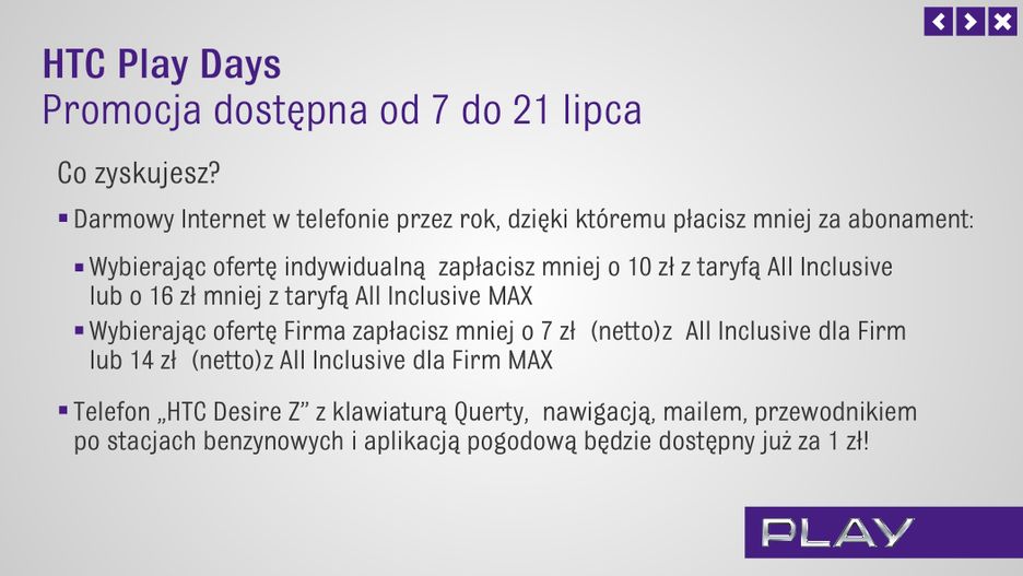 Przy okazji HTC Play Days obniżono cenę wyposażonego w klawiaturę QWERTY smartfona Desire Z. Jedna z lepszych komórek z Androidem i pełną klawiaturą kosztuje złotówkę. Nowa promocja reklamowana będzie w telewizji, radiu i Internecie. Na zlecenie Play przygotowano krótką reklamę HTC Play Days.