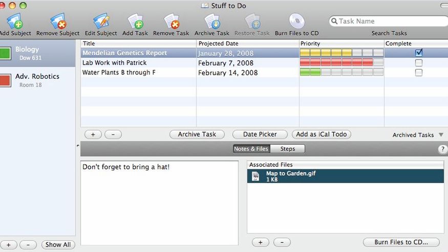 iProcastinate może pomóc w planowaniu wykonywania różnych zadań. Dodając kolejne pozycje do listy "TODO" określamy priorytet zadania, czy do kiedy ma zostać wykonane. Każda z pozycji może mieć przypisane określone pliki, które okażą się pomocne w wykonywaniu zadania.