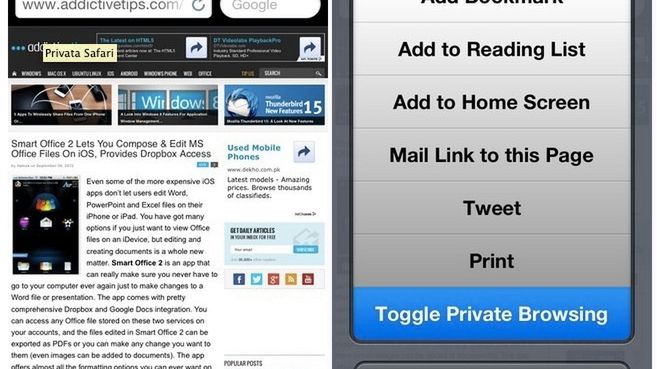 Zadaniem Privaty jest implementacja w menu podręcznym Safari dodatkowy przycisk, odpowiedzialny za aktywację prywatnego przeglądania. Zainstalowanie narzędzia od razu poskutkuje dodaniem przycisku, bez dodatkowych konfiguracji. Potem wystarczy uruchomić Safari, nacisnąć przycisk odpowiedzialy za menu podręczne i wybrać przycisk Toggle Private Browsing, aby przeglądarka natychmiast przybrała czarne barwy, wskazując na aktywność trybu prywatnego.
