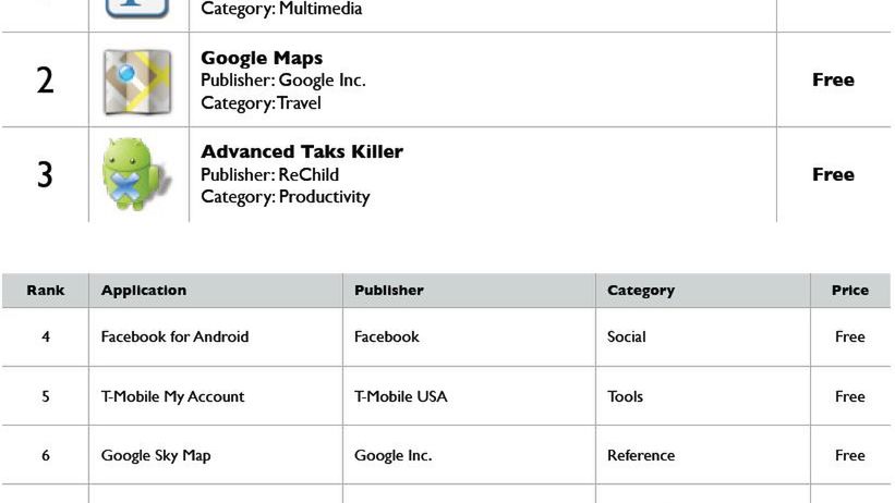 Lista najpopularniejszych bezpłatnych programów (nie uwzględniając gier) została przedstawiona powyżej. Dominuje Pandora Radio, a tuż za nią pojawiło się Google Maps. Facebook, najpopularniejsza aplikacja w mobilnym świecie, zajęła dopiero czwarte miejsce.