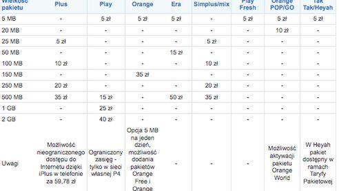 Obecnie najbardziej rozbudową ofertę internetowych pakietów posiada komórkowa sieć Plus, dla abonentów oraz użytkowników pre-paid operator przygotował cztery pakiety do wyboru. Cztery pakiety - ale tylko w ofercie dla klientów abonamentowych - posiada Play, trzy pakiety w abonamencieEra. W przypadku użytkowników pre-paid największy wybór pakietów Internetowych posiadają użytkownicy mixPlus, Simplus oraz 36.6 w Polkomtelu.