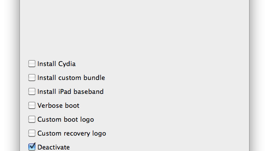 Aby na nowo aktywować urządzenie, należy przeprowadzić ponownie jailbreak przy wykorzystaniu redsn0w 0.9.6b6, z tą różnicą, że podczas tego procesu należy wskazać opcję deactivate (screen wyżej), co spowoduje zastąpienie metod aktywacji.