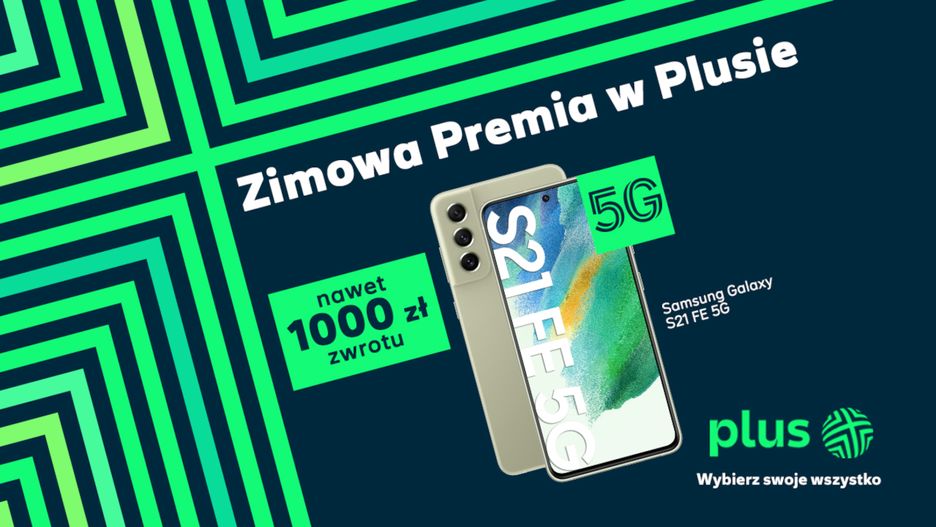 Producent smartfona, przy zakupie modelu Galaxy S21 FE 5G, oferuje zwrot 600 zł przelewem na podany w formularzu rachunek bankowy. Jednocześnie Plus w ramach promocji zapewnia zwrot 400 zł. Pieniądze można odebrać w gotówce w bankomatach Euronet. Łącznie w ramach promocji, klienci mogą więc otrzymać aż 1000 zł zwrotu.