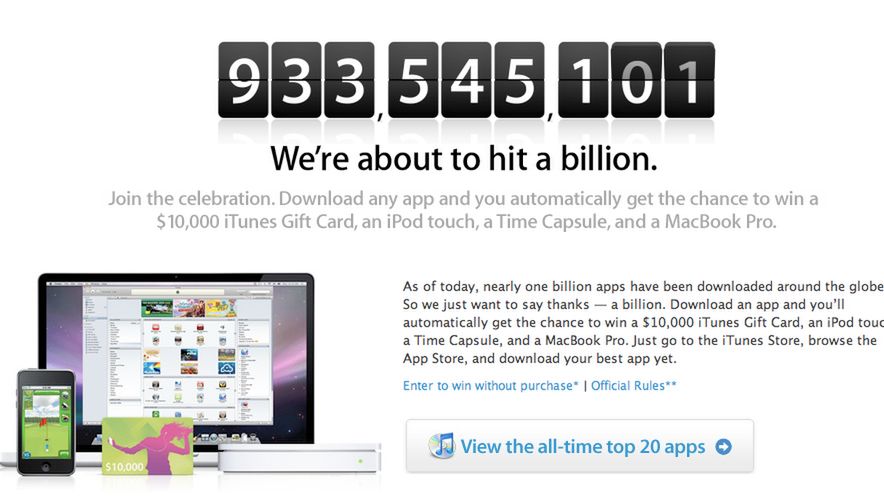 Osoba, która pobierze miliardową aplikację na swoje urządzenie wygra 10 tysięcy dolarów, iPoda touch, Time Capsule oraz MacBooka Pro. Zachęcam jednak do odwiedzenia Billion App Countdown i zapoznania się ze wszystkimi informacjami.