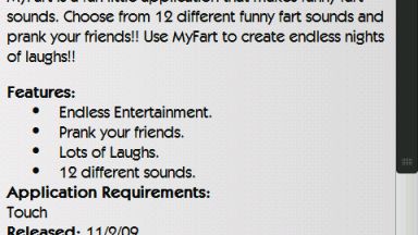 "MyFart jest zabawną aplikacją, która imituje odgłosy zabawnych "pierdów". Użytkownik może wybrać z gamy dwunastu odgłosów i wkurzać swoich przyjaciół! Zabawa z MyFart to niekończące się noce przyjemności!".