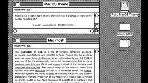 Warto było spędzić wiele czasu na przeszukiwaniu sieci, aby znaleźć ten szablon. Mój ulubiony projekt Retro MacOS stylizuje się na ponad dwudziestoletnim system Apple oznaczonym numerem 6. Całość została utrzymana w oryginalne, czarno-białej stylistyce wiernie odwzorowując styl historycznego programu. To prawdziwa perełka wśród ton bezpłatnej masówki.