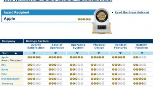 Amerykańska firma JD Power and Associates postanowiła przeprowadzić wywiady pośród użytkowników komórek znanych firm. Respondenci byli pytani, jak oceniają funkcjonowanie swoich urządzeń pod 6 wariantami: ogólne zadowolenie, łatwość obsługi, ocena systemu, zadowolenie z designu, możliwości telefonu oraz żywotność baterii. Najlepiej w testach wypadł iPhone. Najgorzej Palm.