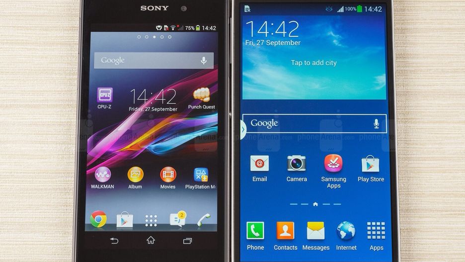 Skupmy się teraz przez chwilę na smartfonach. Ich przekątna ekranu rośnie z roku na rok (Czego bynajmniej nie można powiedzieć o naszych dłoniach). Jednak są to konstrukcje mocno przemyślane pod kątem wygodny użytkowania. Ich ramki są redukowane do minimum i w ten oto sposób otrzymujemy urządzenie z ekranem około 5-5,2" które wielkością nie odbiega od zeszłorocznych flagowców. Jedynie w tej kwestii wyróżnia się Sony, który skupił się bardzo na smukłości i jakości wykonania telefonu, natomiast nie przywiązał zbytnio uwagi do tego, aby ramki dookoła ekranu były możliwie jak najmniejsze . I w ten oto sposób (jak widać na zdjęciu) jest on wielkością bardzo zbliżony do Galaxy Note 3, z tą "drobną" różnicą, że posiada o 0,7 cala mniejszy ekran.