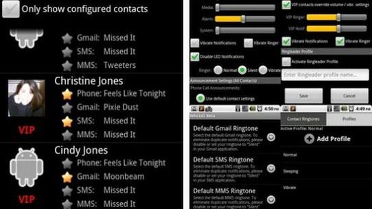 Już na samym screenie po lewej widzimy, że jednemu kontaktowi można przypisać aż 4 różne dźwięki (w zależności od komunikatu: nadchodzące połączenie, SMS, przychodząca poczta czy MMS). Jakby komuś było mało, to można również dowolnie modyfikować rodzaj wibracji dla poszczególnych komunikatów dźwiękowych.