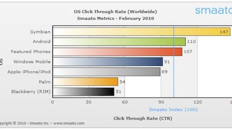 Z opublikowanych danych wynika, że reklama na urządzeniach koncernu Apple staje się coraz mniej opłacalna. CTR dla użytkowników iPhone'ów i iPodów touch spadł po raz kolejny poniżej średniej wartości ustalonej przez Smaato i wynosi obecnie 89 co stawia użytkowników iPhone OS za posiadaczami komórek z systemem Windows Mobile.