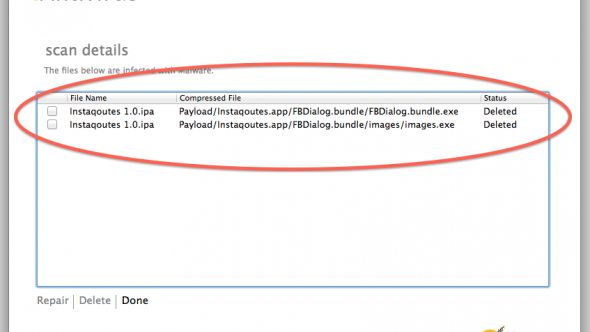 Aby to sprawdzić, ściągnąłem paczkę z Instaquotes i potraktowałem ją darmowym antywirusem Symanteca - iAntivirusem - który wykazał dwa pliki wykonywalne Windowsa będące malware'em.