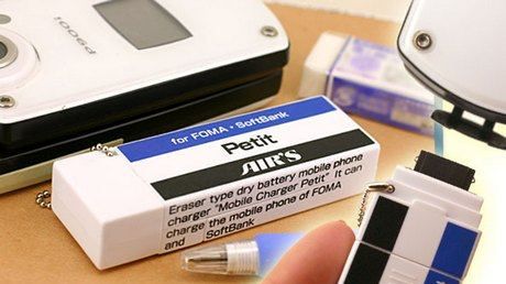 Wynikiem kreatywności Japończyków stała się tym razem ładowarka do telefonu, która do złudzenia przypomina gumkę do mazania, w postaci małego wisiorka. Ładowarka zasilana dwiema bateriami AA oferuje 180 dodatkowych minut pracy komórki.